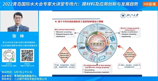 目前,無論是從鹵水提鋰、工業(yè)廢水分鹽資源化處理,還是從濃海水利用、飲用水鈣鎂選擇性去除等各方面來看,單/多價離子鹽分離需求的上漲都是可見的。“納濾是最具潛力的單多價陽離子分離技術(shù)之一”,張林副院長對基于不同分離機(jī)理的離子選擇性NF膜設(shè)計(jì)路徑進(jìn)行了分析,還介紹了新型膜材料。