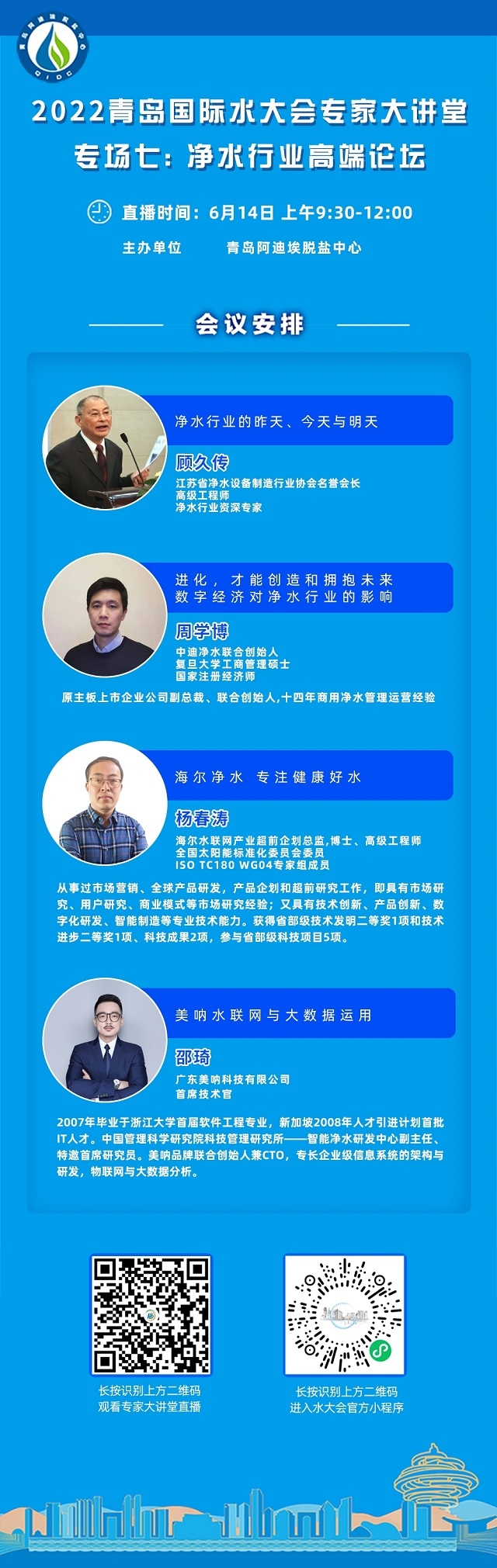 “2022青島國際水大會專家系列大講堂”接力第七場——凈水行業(yè)高端論壇將于6月14日上午登陸環(huán)保在線!緊跟海水淡化、工業(yè)節(jié)水與污水資源化、城鎮(zhèn)水務(wù)、水資源可持續(xù)、水環(huán)境治理、膜材料等議題的熱度,凈水行業(yè)的當(dāng)下與未來,誠邀業(yè)界同仁共探共論。