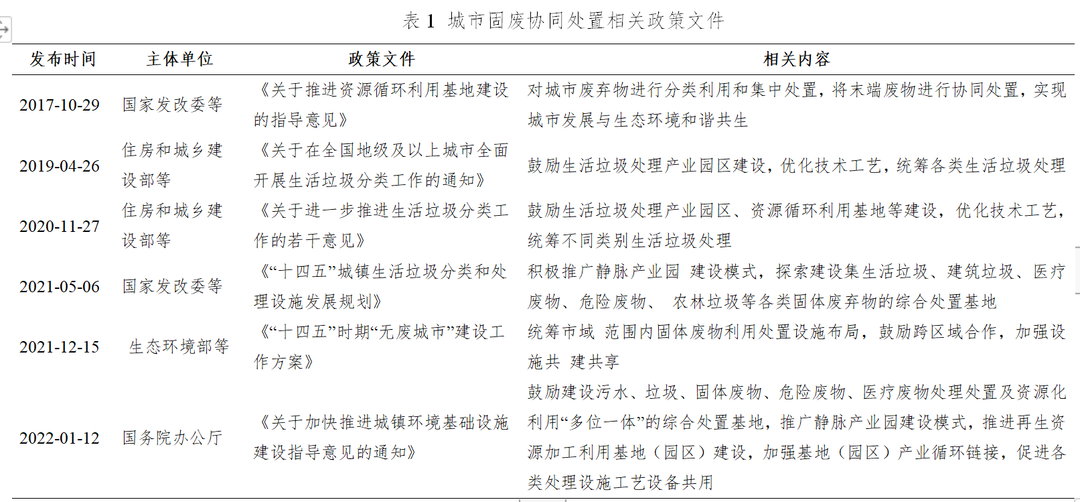 固廢協(xié)同處置園區(qū)是基于循環(huán)經(jīng)濟(jì)理念發(fā)展而來[1],是集多類固體廢棄物的綜合處置基地,以集約、高效、環(huán)保、安全為原則,發(fā)揮協(xié)同處置效應(yīng),實現(xiàn)各類處理設(shè)施工藝設(shè)備共用、資源能源共享、環(huán)境污染共治、責(zé)任風(fēng)險共擔(dān),降低“鄰避”效應(yīng)和社會穩(wěn)定風(fēng)險的園區(qū)。近年來,國家發(fā)改委等部門發(fā)布的政策文件多次提出建立垃圾協(xié)同處置園區(qū),具體如表1所示。