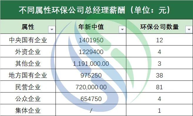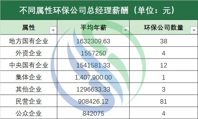“固廢>水務(wù)”這一趨勢(shì)和過去兩年的環(huán)保上市公司業(yè)績(jī)趨勢(shì)一致。中國(guó)水網(wǎng)2020年與2021年的環(huán)保上市公司年報(bào)數(shù)據(jù)統(tǒng)計(jì)結(jié)果顯示,連續(xù)兩年,固廢處置行業(yè)的營(yíng)業(yè)收入與凈利潤(rùn)雙雙超過水務(wù)行業(yè)。近兩年隨著《“十四五”城鎮(zhèn)生活垃圾分類和處理設(shè)施發(fā)展規(guī)劃》、《“十四五”循環(huán)經(jīng)濟(jì)發(fā)展規(guī)劃》、《“十四五”時(shí)期“無(wú)廢城市”建設(shè)工作方案》等政策的出臺(tái),帶動(dòng)了固廢處置行業(yè)中環(huán)衛(wèi)、餐廚垃圾處理等細(xì)分領(lǐng)域的發(fā)展,從而在一定程度上影響了固廢處置行業(yè)環(huán)保上市公司總經(jīng)理們的年薪水平。不過水務(wù)行業(yè)的環(huán)保企業(yè)也不用太焦慮。進(jìn)入“十四五”時(shí)期以來,《關(guān)于推進(jìn)污水資源化利用的指導(dǎo)意見》、《“十四五”城鎮(zhèn)污水處理及資源化利用發(fā)展規(guī)劃》等一系列關(guān)于污水固廢資源化的政策頻繁出臺(tái)。在新建水務(wù)項(xiàng)目越來越少的情況下,國(guó)家也多次出臺(tái)措施助推存量資產(chǎn)盤活,為水務(wù)企業(yè)發(fā)展提供新的思路。此外,從事大氣治理、環(huán)保裝備制造、土壤修復(fù)與環(huán)境監(jiān)測(cè)等細(xì)分領(lǐng)域的企業(yè)隨著近年來國(guó)家政策的出臺(tái),乘著政策紅利的東風(fēng),其市場(chǎng)規(guī)模也日益突顯,相繼迎來發(fā)展高峰。如,《2021-2030年大氣污染治理行業(yè)發(fā)展展望報(bào)告》數(shù)據(jù)顯示,預(yù)計(jì)2021-2025年大氣污染治理市場(chǎng)規(guī)模約為1.6-1.8萬(wàn)億元;在環(huán)保裝備制造領(lǐng)域,工信部、科技部、生態(tài)環(huán)境部三部門于今年1月21日聯(lián)合印發(fā)的《環(huán)保裝備制造業(yè)高質(zhì)量發(fā)展行動(dòng)計(jì)劃》提出,到2025年,環(huán)保裝備制造業(yè)產(chǎn)值要力爭(zhēng)達(dá)到1.3萬(wàn)億元;再如第三方環(huán)境監(jiān)測(cè)運(yùn)營(yíng)市場(chǎng)也逐步釋放,2021年上半年共注冊(cè)5.0萬(wàn)家環(huán)境監(jiān)測(cè)類企業(yè),同比增長(zhǎng)72.4%……種種政策和市場(chǎng)需求創(chuàng)造的紅利為這些細(xì)分領(lǐng)域帶來了積極因素。無(wú)論管理層還是普通員工,都是企業(yè)發(fā)展的一個(gè)“齒輪”,個(gè)人收入的多少都與企業(yè)經(jīng)營(yíng)狀況掛鉤。環(huán)境產(chǎn)業(yè)各細(xì)分領(lǐng)域市場(chǎng)潛力的釋放與從業(yè)者薪資水平正如月球牽引著潮汐,潮漲潮落,有跡可循。筆者按照wind的分類,將143家環(huán)保公司分為中央國(guó)有企業(yè),地方國(guó)有企業(yè)、集體企業(yè)、民營(yíng)企業(yè)、公眾企業(yè)、外資企業(yè)和其他企業(yè)七大類。根據(jù)統(tǒng)計(jì)數(shù)據(jù)顯示,地方國(guó)有企業(yè)以163.23萬(wàn)元的總經(jīng)理平均年薪位列第一,外資企業(yè)和中央國(guó)有企業(yè)分別位列第二、三位,其總經(jīng)理平均年薪分別為155.73萬(wàn)元和154.16萬(wàn)元。前三整體年薪水平差距不大。