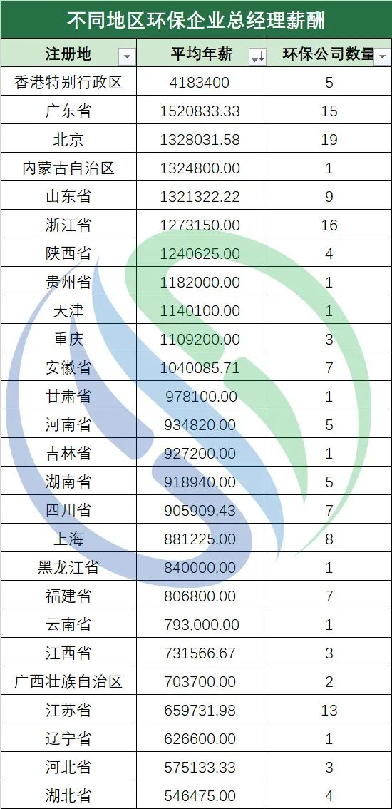 按照上市板塊來看,筆者根據(jù)wind分類結(jié)果,將143家環(huán)保上市公司劃分為主板(包括港股)、科創(chuàng)板、創(chuàng)業(yè)板、北交所四大板塊。根據(jù)各大板塊環(huán)保上市公司總經(jīng)理平均年薪水平來看,在主板上市的環(huán)保公司們以約145.46萬(wàn)元的總經(jīng)理平均年薪遙遙領(lǐng)先,平均年薪高于第二名近50萬(wàn)元,科創(chuàng)板和創(chuàng)業(yè)板位列第二、三名,總經(jīng)理平均年薪分別約為96.98萬(wàn)元和89.91萬(wàn)元,差距不是很大。剛剛成立不滿一年,上市企業(yè)數(shù)量有限的北交所則以76.29萬(wàn)元的總經(jīng)理平均年薪排名第四。主板創(chuàng)立時(shí)間悠久,以傳統(tǒng)產(chǎn)業(yè)為特點(diǎn),上市企業(yè)大多具有市場(chǎng)占有率高、規(guī)模大、基礎(chǔ)好等特點(diǎn),平均年薪排名第一并不意外。科創(chuàng)板、創(chuàng)業(yè)板以及去年正式成立的北交所則以技術(shù)、創(chuàng)新為特色,為中小企業(yè)提供了多種融資渠道,這三大板塊的總經(jīng)理年薪排名也合乎現(xiàn)實(shí)情況。值得注意的是,近兩年瞄準(zhǔn)科創(chuàng)板、創(chuàng)業(yè)板、北交所登陸資本市場(chǎng)的環(huán)保企業(yè)數(shù)量逐步增多。據(jù)中國(guó)水網(wǎng)相關(guān)數(shù)據(jù)統(tǒng)計(jì)顯示,2021年,43家上市環(huán)保企業(yè)中,在創(chuàng)業(yè)板上市的環(huán)保公司有19家,在科創(chuàng)板上市的環(huán)保公司有10家,分列2021年環(huán)保公司上市渠道前二。兩大板塊作為“潛力股”,未來其業(yè)績(jī)能力值得關(guān)注,總經(jīng)理年薪水平或許也將水漲船高。再?gòu)?strong style="margin: 0px;padding: 0px;outline: 0px;box-sizing: border-box !important;overflow-wrap: break-word !important;">企業(yè)注冊(cè)地方面來看,中國(guó)水網(wǎng)所統(tǒng)計(jì)的143家環(huán)保上市公司分別來自26個(gè)省、市、自治區(qū)和特別行政區(qū)。其中,注冊(cè)地位于香港的環(huán)保上市公司總經(jīng)理平均年薪約為418.34萬(wàn)元,遠(yuǎn)高于其它地區(qū),奪得地區(qū)冠軍。廣東、北京緊隨其后,分別以152.08萬(wàn)元與132.8萬(wàn)元位列第二、三名。可以看出,前三地區(qū)的環(huán)保公司年薪水平與地方經(jīng)濟(jì)發(fā)展水平基本保持一致。在統(tǒng)計(jì)范圍內(nèi),內(nèi)蒙古僅一家環(huán)保上市公司,受此影響排名第四,成為特例之一。特例之二是江蘇省,江蘇宜興作為環(huán)保之鄉(xiāng),是環(huán)境產(chǎn)業(yè)的搖籃,多家知名環(huán)保企業(yè)曾與宜興結(jié)下緣分,但其總經(jīng)理平均年薪排名倒數(shù)第四,薪資并不算太高。觀察發(fā)現(xiàn),注冊(cè)地位于江蘇的13家企業(yè)中,多有從事環(huán)保技術(shù)、環(huán)保設(shè)備的企業(yè),體量不大但數(shù)量眾多也是宜興乃至江蘇省環(huán)保企業(yè)的特征之一,這也在一定程度上影響了總經(jīng)理們的年薪水平。由于香港環(huán)保企業(yè)表現(xiàn)亮眼,筆者從上市地點(diǎn)角度對(duì)港股市場(chǎng)環(huán)保企業(yè)和A股市場(chǎng)環(huán)保企業(yè)的總經(jīng)理年薪水平也進(jìn)行了分析:先回顧A股環(huán)保公司總經(jīng)理年薪水平,126家環(huán)保企業(yè)總經(jīng)理平均年薪約為103.18萬(wàn)元,年薪中位值約為84.2萬(wàn)元。17家港股環(huán)保上市公司總經(jīng)理平均年薪約為229.41萬(wàn)元,是A股環(huán)保企業(yè)的兩倍有余。年薪最高的一家港股環(huán)保公司總經(jīng)理年薪超過了1200萬(wàn)元,第二、第三名也都超過了400萬(wàn)元,最低的一家為15萬(wàn)元左右,年薪水平相差較大。港股17家環(huán)保公司年薪中位值約為169.3萬(wàn)元。同時(shí),筆者發(fā)現(xiàn),這些港股環(huán)保公司大多來自香港、廣東、北京等經(jīng)濟(jì)水平較發(fā)達(dá)的地區(qū)。可看出,港股環(huán)保上市公司總經(jīng)理年薪整體水平較A股更高,但內(nèi)部存在較大懸殊,相當(dāng)一部分港股環(huán)保公司和A股市場(chǎng)環(huán)保公司總經(jīng)理年薪水平較接近。如果僅憑以上信息,就斷言A股上市公司總經(jīng)理的收入不如港股上市公司,卻是錯(cuò)誤的。這是因?yàn)锳股和港股總經(jīng)理的收入差異主要來源于披露準(zhǔn)則不同。A股披露依據(jù)證監(jiān)會(huì)頒布的《公開發(fā)行證券的公司信息披露內(nèi)容與格式準(zhǔn)則第2號(hào)年度報(bào)告的內(nèi)容與格式》。其中明確:“將獲得的股權(quán)激勵(lì)按照可行權(quán)股數(shù)、已行權(quán)數(shù)量、行權(quán)價(jià)以及報(bào)告期末市價(jià)單獨(dú)列示,”即A股披露的總經(jīng)理年薪中不包括股權(quán)激勵(lì)部分。而港股披露的年薪中必須包括股權(quán)激勵(lì)的賬面變化。哪行賺錢?