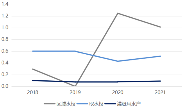 從成交價(jià)格來看,2021年三種交易類型相比2020年變化均不大,區(qū)域水權(quán)交易雖從約1.2元/方跌至約1.0元/方,但仍然大幅高于其它交易類型;取水權(quán)交易從約0.4元/方小幅上漲至約0.5元/方;灌溉用水戶交易自2018年來均保持在約0.1元/方的價(jià)格水平。不同交易類型之間的價(jià)格差異仍然明顯。