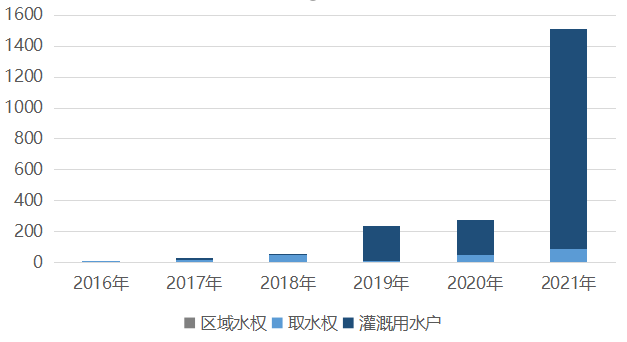 水權(quán)交易包含三種類型:區(qū)域水權(quán)、取水權(quán)和灌溉用水戶交易。其中,區(qū)域水權(quán)交易為政府主導(dǎo),交易主體通常為地方政府或水庫等,實(shí)現(xiàn)水資源跨區(qū)域調(diào)配,通常規(guī)模最大;取水權(quán)交易為用水主體主導(dǎo),包括企業(yè)等各類型對取水有需求的單位,規(guī)模較大;灌溉用水戶交易多為農(nóng)戶向村委會購買水權(quán)或村組之間交易水權(quán),規(guī)模較小。