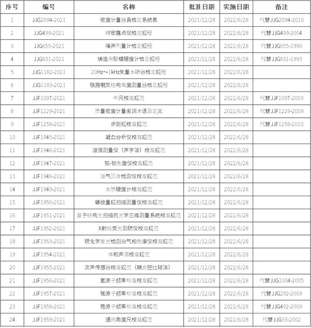 2021年12月30日,市場(chǎng)監(jiān)管總局發(fā)布了24項(xiàng)國(guó)家計(jì)量技術(shù)規(guī)范,均自2022年6月28日起實(shí)施。
