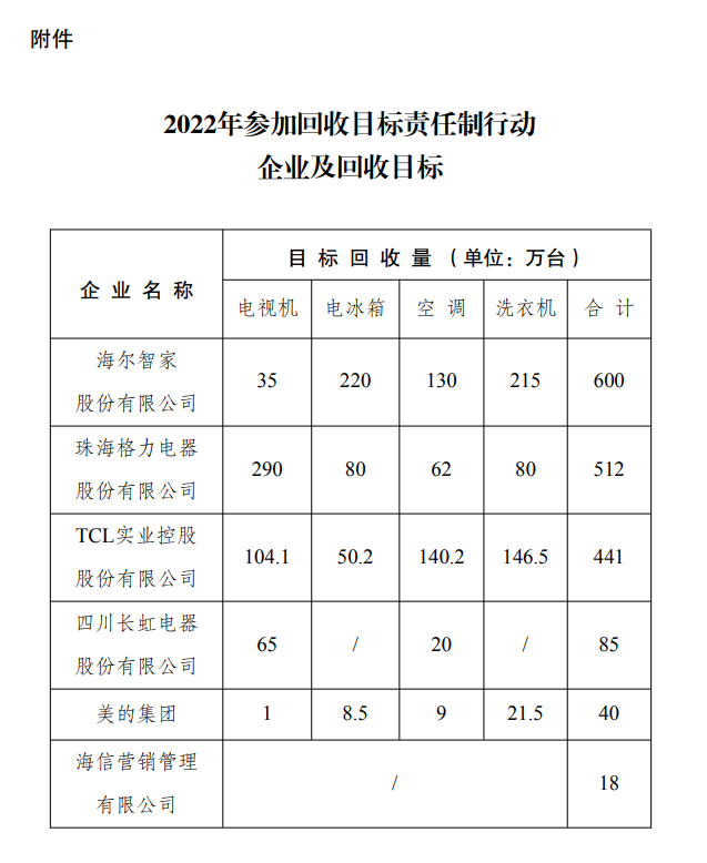 2022年5月,國家發(fā)展改革委辦公廳、工業(yè)和信息化部辦公廳、生態(tài)環(huán)境部辦公廳印發(fā)《關(guān)于做好2022年家電生產(chǎn)企業(yè)回收目標(biāo)責(zé)任制行動有關(guān)工作的通知》,確定了6家開展2022年回收目標(biāo)責(zé)任制行動的企業(yè)(見附件)。