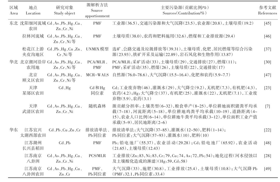 關(guān)于華北地區(qū)土壤重金屬源解析的近期文章共發(fā)現(xiàn)了13篇,涉及北京、天津、河北、山西和內(nèi)蒙古地區(qū)的2831個(gè)表層土壤樣品,所采用的定性源解析方法主要為PCA、相關(guān)性分析、空間分析等,定量源解析方法有PMF、PCA-MLR、同位素比值法等(表3)。總體上,華北地區(qū)農(nóng)田土壤中的主要污染重金屬元素是Cd,其次有Cu、Hg、Zn、Pb等。該地區(qū)農(nóng)田土壤中的As、Cr、Ni主要受土壤母質(zhì)的控制,個(gè)別地方的As還有采礦活動(dòng)和大氣沉降的貢獻(xiàn);除此以外,其余重金屬元素都受到一定程度的外源污染。Cd、Cu和Zn的污染來(lái)源仍以農(nóng)業(yè)活動(dòng)(肥料、農(nóng)藥、灌溉水)為主,部分地區(qū)Cd還受到工業(yè)活動(dòng)的影響。對(duì)于Pb的來(lái)源,土壤母質(zhì)、采礦活動(dòng)、大氣沉降、污水灌溉等都有一定程度的貢獻(xiàn)。Hg主要受大氣沉降和灌溉水控制,局部地區(qū)有工業(yè)活動(dòng)的影響。對(duì)于工業(yè)區(qū)周邊的非農(nóng)田土壤來(lái)說(shuō),重金屬的累積明顯與工業(yè)活動(dòng)、燃煤、交通排放緊密相關(guān)。