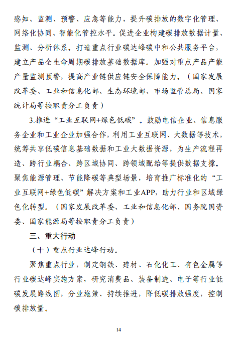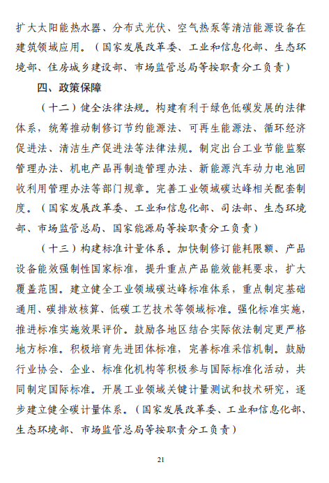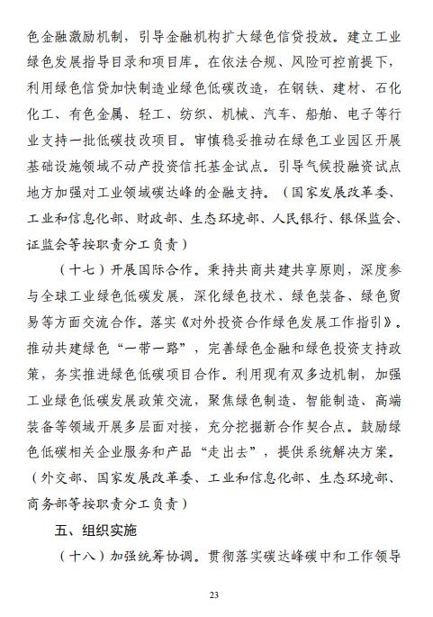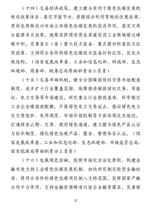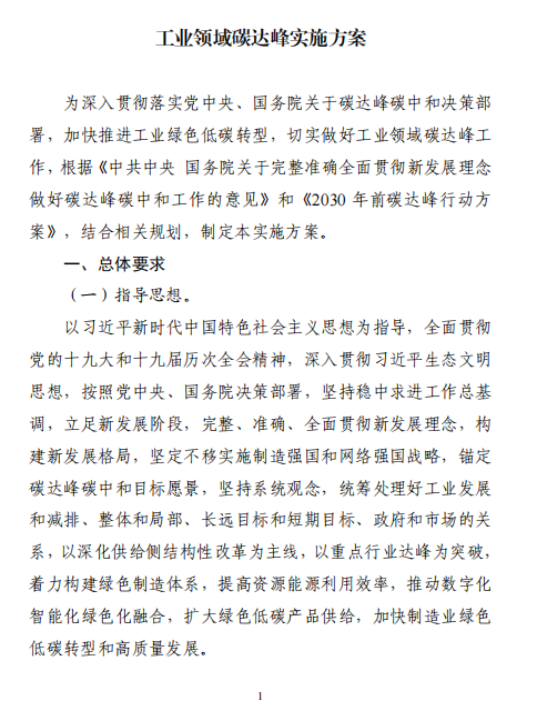 工業(yè)和信息化部 國(guó)家發(fā)展改革委 生態(tài)環(huán)境部關(guān)于印發(fā)工業(yè)領(lǐng)域碳達(dá)峰實(shí)施方案的通知工信部聯(lián)節(jié)〔2022〕88號(hào)外交部、科技部、司法部、財(cái)政部、住房城鄉(xiāng)建設(shè)部、交通運(yùn)輸部、商務(wù)部、人民銀行、國(guó)資委、稅務(wù)總局、市場(chǎng)監(jiān)管總局、統(tǒng)計(jì)局、銀保監(jiān)會(huì)、證監(jiān)會(huì)、能源局、林草局、郵政局,各省、自治區(qū)、直轄市及計(jì)劃單列市、新疆生產(chǎn)建設(shè)兵團(tuán)工業(yè)和信息化主管部門、發(fā)展改革委、生態(tài)環(huán)境廳(局):《工業(yè)領(lǐng)域碳達(dá)峰實(shí)施方案》已經(jīng)碳達(dá)峰碳中和工作領(lǐng)導(dǎo)小組審議通過(guò),現(xiàn)印發(fā)給你們,請(qǐng)認(rèn)真貫徹落實(shí)。