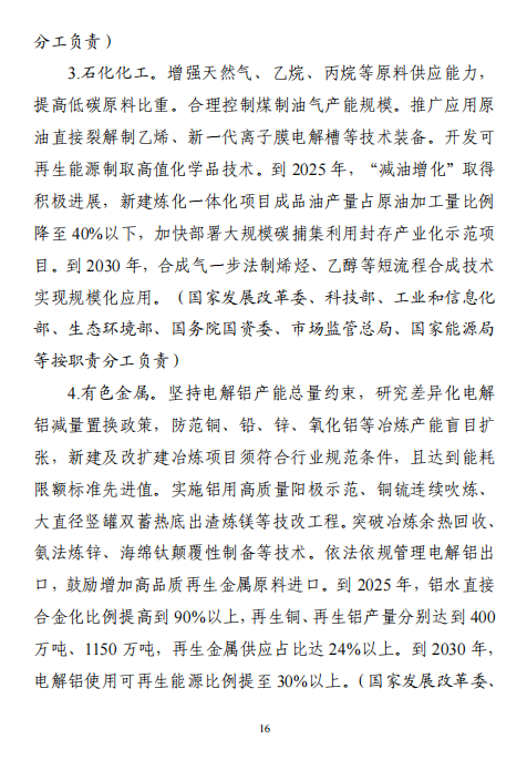 “十五五”期間,產(chǎn)業(yè)結(jié)構(gòu)布局進(jìn)一步優(yōu)化,工業(yè)能耗強(qiáng)度、二氧化碳排放強(qiáng)度持續(xù)下降,努力達(dá)峰削峰,在實(shí)現(xiàn)工業(yè)領(lǐng)域碳達(dá)峰的基礎(chǔ)上強(qiáng)化碳中和能力,基本建立以高效、綠色、循環(huán)、低碳為重要特征的現(xiàn)代工業(yè)體系。確保工業(yè)領(lǐng)域二氧化碳排放在2030年前達(dá)峰。方案指出,加強(qiáng)再生資源循環(huán)利用。實(shí)施廢鋼鐵、廢有色金屬、廢紙、廢塑料、廢舊輪胎等再生資源回收利用行業(yè)規(guī)范管理,鼓勵(lì)符合規(guī)范條件的企業(yè)公布碳足跡。延伸再生資源精深加工產(chǎn)業(yè)鏈條,促進(jìn)鋼鐵、銅、鋁、鉛、鋅、鎳、鈷、鋰、鎢等高效再生循環(huán)利用。研究退役光伏組件、廢棄風(fēng)電葉片等資源化利用的技術(shù)路線和實(shí)施路徑。圍繞電器電子、汽車等產(chǎn)品,推行生產(chǎn)者責(zé)任延伸制度。推動(dòng)新能源汽車動(dòng)力電池回收利用體系建設(shè)。