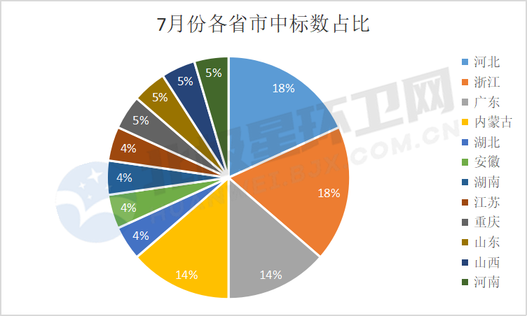 眾所周知,河北、浙江、廣東地區(qū)環(huán)衛(wèi)市場一直相當火熱,7月也不例外,河北、浙江省均成交4個項目,成交額分別是24.06億元、20.43億元,榮獲冠、亞軍。