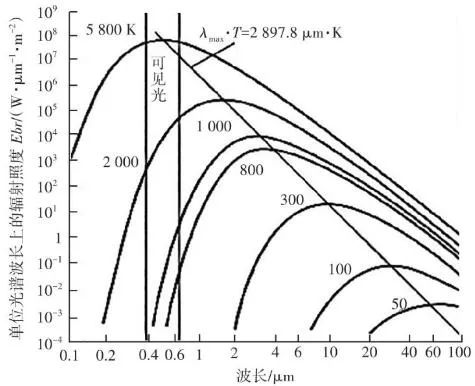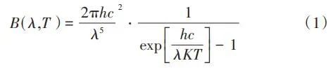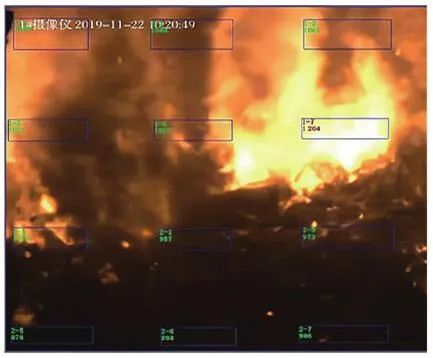 根據(jù)普朗克(Plank)黑體輻射定律,自然界的任何物體只要溫度高于絕對(duì)零度(-273.15 ℃),就會(huì)以電磁輻射的形式在非常寬的波長(zhǎng)范圍內(nèi)發(fā)射能量,產(chǎn)生電磁波(輻射能)。不同的材料、溫度、表面光度及顏色,發(fā)出的紅外輻射強(qiáng)度都不同,大氣電磁光譜示意見(jiàn)圖4。普朗克輻射定律給出了黑體輻射的具體譜分布,在一定溫度下,單位面積的黑體在單位時(shí)間、單位立體角內(nèi)和單位波長(zhǎng)間隔內(nèi)輻射出的能量見(jiàn)公式(1):式中:B(λ,T)為黑體的光譜輻射亮度(W?m-2?Sr-1?μm-1);T為黑體的絕對(duì)溫度(K);c為光速,c=2.998×108 m/s;h為普朗克常數(shù),h=6.626×10-34 J?s;K為波爾茲曼常數(shù),K=1.380×10-23 J/K。在一定溫度下,黑體的光譜輻射亮度存在一個(gè)極值,這個(gè)極值的位置與溫度有關(guān),這就是維恩位移定律(Wien):式中:λmax為最大黑體光譜輻射亮度處的波長(zhǎng)(μm);T為黑體的絕對(duì)溫度(K);b為維恩常量,b=0.002 897 m·K(2.897×103μm·K)。根據(jù)Wien定律,我們可以估算,當(dāng)T=6 000 K時(shí),λmax為0.48 μm(綠色),這就是太陽(yáng)輻射中大致的最大光譜輻射亮度處。當(dāng)T=300 K,λmax=9.6 μm,這就是地球物體輻射中大致最大光譜輻射亮度處。普朗克定律描述的黑體輻射在不同溫度下的頻譜見(jiàn)圖5。根據(jù)圖5中數(shù)據(jù),可以得到如下結(jié)論:隨著溫度升高,輻射能量增加,這是紅外輻射理論的出發(fā)點(diǎn),也是單波段紅外測(cè)溫設(shè)計(jì)的依據(jù)。隨著溫度升高,輻射峰值波長(zhǎng)向短波方向移動(dòng),其規(guī)律符合Wien定律,即λmax?T=2 897.8 μm?K。這個(gè)公式解釋了為什么“高溫測(cè)溫儀”多采用短波,“低溫測(cè)溫儀”多采用長(zhǎng)波。輻射能量隨溫度的變化率,短波比長(zhǎng)波大,即短波處工作的“測(cè)溫儀”相對(duì)信噪比高,抗干擾性強(qiáng)。由Wien定律可以得出,溫度越高,輻射峰值的波長(zhǎng)越短。所以為了使輻射接收器有一個(gè)較理想的信噪比,對(duì)于溫度越低的物體,可測(cè)量的輻射波長(zhǎng)越長(zhǎng)。近年來(lái),利用光電轉(zhuǎn)換元件(Charge Coupled Device,CCD),即“電荷耦合元件”測(cè)量和監(jiān)測(cè)火焰溫度的方法受到越來(lái)越多的關(guān)注,國(guó)內(nèi)外先后開(kāi)展了大量研究。CCD用于將鏡頭收集到的光信號(hào)轉(zhuǎn)變?yōu)殡娦盘?hào)從而進(jìn)行進(jìn)一步處理。日本因其先進(jìn)的電子技術(shù)及對(duì)環(huán)保的強(qiáng)烈意識(shí),最先在燃燒診斷中應(yīng)用了數(shù)字圖像處理技術(shù)。法國(guó)的Renier等通過(guò)CCD相機(jī)獲得物體表面圖像,隨后通過(guò)黑體爐標(biāo)定并利用輻射定律來(lái)得到輻射物體表面參數(shù),同時(shí)他們將濾光片加在CCD相機(jī)前來(lái)提高系統(tǒng)的靈敏性并擴(kuò)大測(cè)溫范圍。我國(guó)生活垃圾焚燒火焰產(chǎn)生的固體顆粒物主要為炭黑顆粒和飛灰,火焰面內(nèi)部固體顆粒為炭黑顆粒,而飛灰主要彌散在火焰面外部。炭黑顆粒相較于飛灰具有更小的結(jié)構(gòu)尺寸,意味著其擁有更大的比表面積,即更大的輻射表面積,進(jìn)而擁有更強(qiáng)的發(fā)射輻射能力。因此生活垃圾焚燒火焰連續(xù)光譜強(qiáng)度主要由其中的炭黑顆粒主導(dǎo)。生活垃圾焚燒后氣體產(chǎn)物如H2O、CO2、CO、NO等物質(zhì)的發(fā)射光譜多分布在近紫外和遠(yuǎn)紅外區(qū)域,而在λ為0.5~0.9 μm波段上很少有發(fā)射光譜存在,對(duì)于本系統(tǒng)的測(cè)溫效果幾乎沒(méi)有干擾。因此,在λ=0.5~0.9 μm波段上炭黑顆??杀徽J(rèn)為是火焰發(fā)射輻射的主導(dǎo)者,進(jìn)而將生活垃圾焚燒火焰輻射特性的研究轉(zhuǎn)變?yōu)槠渲刑亢陬w粒輻射特性的研究。而垃圾焚燒爐內(nèi)測(cè)量區(qū)域的火焰及煙氣溫度基本在700~1 200 ℃,對(duì)應(yīng)的黑體絕對(duì)溫度在973~1 473 K(圖5),此溫度下黑體輻射最強(qiáng)的波段集中在短波區(qū)域,因此為適應(yīng)垃圾焚燒爐的特性需要采取短波高溫?zé)岢上駜x。綜上所述,最終本系統(tǒng)選取的CCD響應(yīng)光譜范圍在0.4~1.0 μm,其中0.4~0.8 μm為可見(jiàn)光圖像, 0.8~1.0 μm的近紅外光用于測(cè)溫。對(duì)于垃圾焚燒來(lái)說(shuō),在0.4~1.0 μm波長(zhǎng)區(qū)間主要存在的化學(xué)發(fā)光來(lái)自于Na、K、Rb等堿金屬的特征譜線,而這些譜線的波長(zhǎng)大都≤0.8 μm,所以對(duì)用于測(cè)溫的0.8~1.0 μm波段影響較小。針對(duì)垃圾焚燒應(yīng)用環(huán)境存在爐溫波動(dòng)大、閾值范圍廣的現(xiàn)象,可以通過(guò)軟件對(duì)爐內(nèi)溫度閾值進(jìn)行設(shè)置,實(shí)現(xiàn)超溫報(bào)警、低溫報(bào)警,以實(shí)現(xiàn)當(dāng)爐內(nèi)局部的“熱點(diǎn)”溫度過(guò)高或者局部爐溫降低時(shí),分別通過(guò)降風(fēng)、減料和增風(fēng)、加料等操作來(lái)改善爐內(nèi)工況。某項(xiàng)目單臺(tái)750 t/d焚燒爐紅外成像畫(huà)面見(jiàn)圖6。因紅外探頭由焚燒爐后拱俯視爐內(nèi),所呈現(xiàn)的畫(huà)面并非為整體的火焰鋒面,而是分散的柱狀火焰。同區(qū)域火焰亮度、高度有明顯差異。相比爐膛火焰監(jiān)視器呈現(xiàn)的豎直火焰鋒面在縱向深度上有更為廣泛的視角跨度。圖6 紅外熱成像系統(tǒng)顯示畫(huà)面圖6中所示藍(lán)色方框