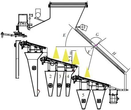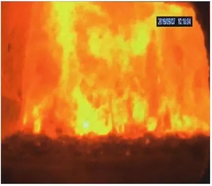 當(dāng)前生活垃圾焚燒爐廣泛采用的爐膛火焰監(jiān)視系統(tǒng)基本上都是由早期應(yīng)用在水泥廠、鋼鐵廠的加熱爐、退火爐和氧化鋁廠等行業(yè)內(nèi)的高溫看火工業(yè)電視演變升級(jí)而來(lái)。內(nèi)窺式數(shù)字高清爐膛火焰監(jiān)視系統(tǒng)成像裝置主要由耐高溫針孔電動(dòng)鏡頭、寶石物鏡、光學(xué)濾光片、光圈焦距調(diào)節(jié)器等組成,配有電控推進(jìn)器、氣源控制柜、光端機(jī)等輔助設(shè)備。其核心問(wèn)題是如何在生活垃圾焚燒爐的高溫、多塵、強(qiáng)腐蝕環(huán)境中長(zhǎng)周期穩(wěn)定運(yùn)行,保證火焰畫(huà)面不丟包、不失真。1)優(yōu)勢(shì)特性分析。一是技術(shù)成熟、運(yùn)行穩(wěn)定。隨著我國(guó)近一二十年間生活垃圾發(fā)電廠的興建,爐膛火焰監(jiān)視系統(tǒng)的技術(shù)也處于不停地優(yōu)化和迭代之中,目前已能滿足穩(wěn)定、可靠的要求。其中常規(guī)配置參數(shù)為攝像頭300 萬(wàn)像素,響應(yīng)時(shí)間2 s,光圈(F數(shù))1.6,焦距2.4 mm。二是工作環(huán)境好。爐膛火焰監(jiān)視器探頭通常安裝于焚燒爐后墻,所處位置是垃圾燃燒最末端,常規(guī)工況下探頭周?chē)鸁煔鉁囟韧ǔ?lt;600 ℃。較之焚燒爐其他高溫環(huán)境已算“宜居地帶”。三是維護(hù)量小。焚燒爐后墻幾乎沒(méi)有結(jié)焦現(xiàn)象,常規(guī)爐膛火焰監(jiān)視探頭開(kāi)孔位置僅存有因爐膛偶爾正壓時(shí)煙氣外冒造成的積灰,積灰量不大,清理工作較為輕松。2)劣勢(shì)特性分析。一是參數(shù)單一。因垃圾焚燒行業(yè)爐型構(gòu)造和燃燒成分的特殊性,垃圾焚燒爐長(zhǎng)期采用的火焰探頭利用的是光學(xué)成像原理,運(yùn)行人員僅能通過(guò)觀察火焰形狀和位置來(lái)判斷焚燒爐工況,無(wú)法得到多維度參數(shù)。二是視角局限。爐膛火焰探頭通常位于焚燒爐后墻,安裝角度朝向爐內(nèi)成斜向上方向,與水平線夾角15°左右,探頭視場(chǎng)角通常>60°。以某大型列動(dòng)順推爐排焚燒爐為例,在此仰視角度下可以看到爐排燃燒段尾部、燃燼段前部?jī)擅婷黠@的火焰幕墻,由于火焰鋒面遮擋,很難觀察到燃燒段中前部的火焰狀況。 以某單臺(tái)750 t/d大型列動(dòng)順推爐排焚燒爐中爐膛火焰監(jiān)視器安裝位置和顯示畫(huà)面為實(shí)例,具體分析火焰成像狀態(tài)。其實(shí)際火焰成像畫(huà)面見(jiàn)圖1。成像角度是由焚燒爐后墻探頭位置向上仰視爐膛。因焚燒工況十分良好,靠近后墻的燃燼段區(qū)域幾乎沒(méi)有明火,燃燒段尾部成一面豎直、光亮的黃紅色火焰鋒面,高度約為2.5 m。對(duì)應(yīng)的爐膛火焰監(jiān)視器安裝示意如圖2所示。爐膛火焰探頭安裝在焚燒爐后墻,安裝位置與后墻觀火平臺(tái)地面距離為C(m)。開(kāi)孔傾角與水平方向夾角為B(°),有效視場(chǎng)角為A(°)。圖2中由黃色填充的三角形區(qū)域代表正常燃燒火焰,其中標(biāo)注高度2.5 m的區(qū)域?yàn)槿紵隣t排尾部火焰,即為圖1所顯示的火焰鋒面。顯然,從爐膛火焰監(jiān)視器向上望去,燃燒段前部、中部火焰為視野盲區(qū)。由于被燃燒段尾部火焰鋒面遮擋,通過(guò)火焰監(jiān)視器通常只能看到燃燒段尾部、燃燼段前部這兩個(gè)區(qū)域的火焰。
