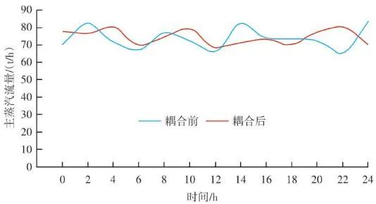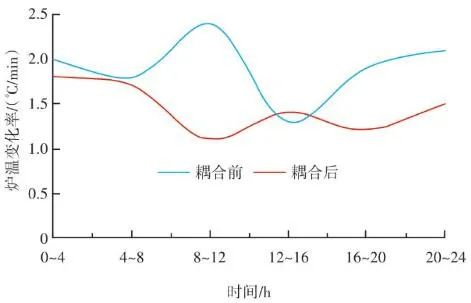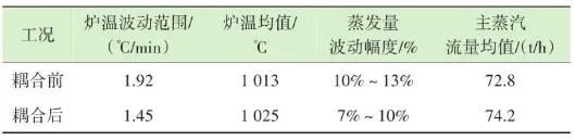 生活垃圾焚燒爐的排放物在滿足GB 18485—2014 生活垃圾焚燒污染控制標(biāo)準(zhǔn)的前提下,為保障焚燒爐的長(zhǎng)期安全運(yùn)行、汽機(jī)系統(tǒng)的穩(wěn)定高效運(yùn)轉(zhuǎn),通常通過(guò)爐溫和主蒸汽流量這兩個(gè)因素來(lái)判斷鍋爐運(yùn)行是否良好。以下工況為某項(xiàng)目單臺(tái)750 t/d生活垃圾焚燒爐在紅外熱成像管理系統(tǒng)應(yīng)用前、應(yīng)用后兩段時(shí)期的實(shí)際運(yùn)行參數(shù),以此實(shí)例來(lái)解析該系統(tǒng)的運(yùn)行效果。該項(xiàng)目額定主蒸汽流量為74 t/h。如圖10所示,藍(lán)色實(shí)線為耦合前24 h變化率波動(dòng)范圍,紅色實(shí)線為耦合后24 h變化率波動(dòng)范圍。爐溫變化率指的是焚燒爐上、中、下3層共計(jì)9個(gè)溫度測(cè)點(diǎn)的熱電偶反饋溫度在每分鐘內(nèi)升高或降低的溫度值,而溫度變化率波動(dòng)范圍指的是單位時(shí)間內(nèi)溫度變化率最高值與最低值之間的溫度差,該差值越大表明爐溫波動(dòng)越大,即工況越不穩(wěn)定,波動(dòng)范圍越小表明工況越平穩(wěn)。此期間溫度也一直未低于環(huán)保部要求的最低限(850 ℃/2 s),均介于950~1 050 ℃。焚燒爐主蒸汽流量曲線如圖11所示,左側(cè)縱坐標(biāo)為主蒸汽流量,額定蒸發(fā)量74 t/h。圖中藍(lán)色實(shí)線為紅外熱成像系統(tǒng)與ACC系統(tǒng)耦合前24 h的主蒸汽流量曲線,紅色虛線為紅外熱成像系統(tǒng)與ACC系統(tǒng)耦合后24 h的主蒸汽流量曲線。表1中參數(shù)可以計(jì)算出耦合前后焚燒爐爐溫波動(dòng)范圍相對(duì)縮減了24.5%,焚燒爐爐溫均值提高了1.2%,蒸發(fā)量波動(dòng)幅度縮減了3個(gè)百分點(diǎn),主蒸汽流量提高了1.4 t/h。經(jīng)過(guò)對(duì)主要運(yùn)行參數(shù)的定量分析,可以看出結(jié)合了紅外熱成像系統(tǒng)的ACC系統(tǒng)在功能性和穩(wěn)定性上有顯著提升。表1 重要運(yùn)行參數(shù)統(tǒng)計(jì)基于目前紅外熱成像管理系統(tǒng)的功能,正在逐步進(jìn)行焚燒爐溫度場(chǎng)重構(gòu)工作,對(duì)于紅外探頭收集的大量溫度點(diǎn)實(shí)時(shí)數(shù)據(jù)進(jìn)行整合并進(jìn)行紅外溫度顯示。傳感器擁有1 440×1 080個(gè)像素,其中每個(gè)像素都有對(duì)應(yīng)的溫度值,該溫度值隨著目標(biāo)溫度的變化在800~1 600 ℃對(duì)應(yīng)變化,那么我們就可以將800~1 600 ℃這個(gè)范圍內(nèi)的溫度數(shù)據(jù)映射到顏色空間中特定的彩色序列,只要在程序中明確規(guī)定溫度和顏色之間的映射函數(shù)和映射表即可實(shí)現(xiàn)相應(yīng)的偽彩顯示,即熱像圖的形式。這樣可為運(yùn)行人員提供更為直觀、立體的參考依據(jù),待溫度場(chǎng)重構(gòu)系統(tǒng)成熟后,再與ACC系統(tǒng)進(jìn)行結(jié)合,進(jìn)一步提高全廠的自動(dòng)化程度。紅外熱成像管理系統(tǒng)在生活垃圾焚燒控制領(lǐng)域,與傳統(tǒng)ACC系統(tǒng)經(jīng)過(guò)合理的設(shè)計(jì)、安裝、邏輯耦合后,對(duì)焚燒自動(dòng)化有以下幾個(gè)方面的改變和提升。1)視野擴(kuò)大。改變探頭安裝位置后,成像角度由仰視變?yōu)楦┮?,拓寬了爐內(nèi)火焰視場(chǎng)角度?;鹧娉上裥螤钣伞耙幻婊饓Α?提升為“一片火海”。在具備最基本的“遠(yuǎn)程看火”功能前提下,為運(yùn)行人員提供更強(qiáng)有力的參考依據(jù)。2)測(cè)溫準(zhǔn)確。紅外熱成像原理相比傳統(tǒng)光學(xué)成像原理,增加了溫度反饋功能。利用軟件管理系統(tǒng),將溫度信號(hào)解析,并與實(shí)際區(qū)域一一對(duì)應(yīng)。3)靈活性高。溫度測(cè)點(diǎn)的選定可通過(guò)管理軟件任意選擇,調(diào)試結(jié)束后仍可根據(jù)實(shí)際工況進(jìn)行設(shè)置和改變。4)耦合性強(qiáng)。紅外熱成像管理系統(tǒng)除現(xiàn)有功能外更像是一個(gè)平臺(tái),可以對(duì)現(xiàn)有溫度參數(shù)和火焰狀態(tài)的大量數(shù)據(jù)進(jìn)行進(jìn)一步提升和利用,例如正在進(jìn)行的溫度場(chǎng)成像功能優(yōu)化和升級(jí)工作。5)效益提升。紅外熱成像管理系統(tǒng)融入ACC系統(tǒng)后,對(duì)焚燒爐溫度、鍋爐主蒸汽流量的穩(wěn)定性有顯著提升。對(duì)減少運(yùn)行人員工作量、增加產(chǎn)汽量、發(fā)電量等焚燒廠經(jīng)濟(jì)效益方面有不同程度提升。