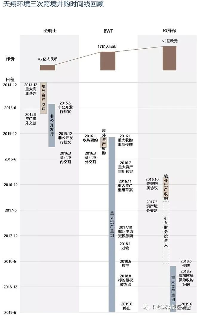 原本的十大并購案例,寫著寫著寫成了十大環(huán)保并購慘案。為了緩解大家失落悵惘的心情,免費(fèi)奉上一個(gè)跌到谷底的案子,大家再忍一忍,黎明前的黑暗。本文為環(huán)保十大并購案例之五,天翔環(huán)境海外收購圣騎士、BWT、歐綠保,最終公司破產(chǎn)退市。我們之前看的幾個(gè)并購失敗案例,雖然也都是十年苦心經(jīng)營,毀于一旦,但大部分只是元?dú)獯髠?,主營業(yè)務(wù)利潤虧光,大股東黯然離場而已。今天的案例,并購的后果是上市公司破產(chǎn)退市,大股東債務(wù)纏身被檢查機(jī)關(guān)起訴,員工債權(quán)人均蒙受巨大損失。里里外外大幾十億的虧損,堪稱“環(huán)保上市公司十年內(nèi)最大的慘案”。歡迎大家多提寶貴意見。尋找底層規(guī)律,帶動行業(yè)發(fā)展,避免低級錯(cuò)誤重現(xiàn)。幾經(jīng)掙扎的天翔環(huán)境最終還是在2021年8月30日迎來了被深交所摘牌的結(jié)局。天翔環(huán)境原名天保重裝,原主業(yè)為大型節(jié)能環(huán)保及清潔能源設(shè)備,具體包括分離機(jī)械系列設(shè)備和水輪發(fā)電機(jī)組設(shè)備,并于2014年完成上市。當(dāng)時(shí),天翔環(huán)境的主營已露疲態(tài),上市當(dāng)年收入下滑超過30%,公司開始尋找轉(zhuǎn)型方向。2015年開始,天翔環(huán)境通過連續(xù)的大手筆并購進(jìn)軍環(huán)保領(lǐng)域,先后以4.7億收購美國的污泥處理設(shè)備公司圣騎士、17億收購德國的水處理公司BWT,并在隨后迎來了自己的高光時(shí)刻,2016年底,其市值來到了107.5億的歷史最高值。好景不長,因?yàn)轶w外并購未能裝入上市公司,導(dǎo)致了一系列問題,悲劇大幕就此拉開。2018年,天翔環(huán)境在年報(bào)中披露,控股股東直接控制的成都親華科技有限公司非經(jīng)營性資金占用24.55億,而當(dāng)時(shí)天翔環(huán)境本身的債務(wù)逾期金額已達(dá)到17.58億。從此,天翔環(huán)境股價(jià)持續(xù)下跌,直至2021年8月30日最終被深交所摘牌。回顧天翔環(huán)境的發(fā)展歷程,核心是三次海外收購,分別是2014年12月收購的美國圣騎士,2016年1月收購的BWT公司,2016年10月收購的歐綠保,交易金額預(yù)期超過3億歐元。其中第一個(gè)交易順利完成,后面兩個(gè)交易只完成了體外收購,并沒有完成裝入上市公司的動作,最終也導(dǎo)致了上市公司與大股東的相繼崩盤。第一筆收購,公司與券商聯(lián)合成立基金,收購標(biāo)的公司。然后上市公司非定向增發(fā),募集資金收購基金持股。收購與定增并行推進(jìn),加快交易節(jié)奏,順利地完成了交易。這個(gè)案子金額相對小,方案謹(jǐn)慎,交易結(jié)構(gòu)簡單,資本市場當(dāng)時(shí)資金充足,因此完成相對容易些。企業(yè)由此嘗到了甜頭,默認(rèn)為其他項(xiàng)目也可以先收購,再定增裝入上市公司。2016年2月,僅僅在上市公司剛剛完成非公開發(fā)行一個(gè)月、圣騎士股權(quán)尚未完成交割之時(shí),天翔環(huán)境又再次啟動了對更大的收購標(biāo)的——估值達(dá)到2.2億歐元的德國水處理公司BWT。因?yàn)榻灰讜r(shí)間緊張,天翔和基金先籌集資金收購,然后再由大股東組建資金替代基金,大股東向其他人承諾兜底,最終由上市公司定增完成收購。在當(dāng)時(shí)的背景下,是有很多基金愿意參與并購定增,同時(shí)也默認(rèn)定增即可賺錢的邏輯,愿意參與這種有一定風(fēng)險(xiǎn)的投資。基金的收益在于定增后的股價(jià)增值,以及定增不成的大股東保底,風(fēng)險(xiǎn)在于定增后股價(jià)下跌,定增失敗后大股東無法保底。當(dāng)時(shí)環(huán)境下,基金方總體上還是認(rèn)為風(fēng)險(xiǎn)收益匹配的。這種情況跟當(dāng)時(shí)的熱錢有關(guān),即大部分資金來自信托,錢多無處可投。當(dāng)時(shí)的資金投資邏輯并不穩(wěn)定,是一種特殊情況。但第二筆收購出現(xiàn)了問題,監(jiān)管機(jī)構(gòu)審核達(dá)2年之久。兩個(gè)原因,一個(gè)是券商的原因,一個(gè)是資金的來源問題。最終獲得批文的時(shí)間已經(jīng)是2018年6月。雪上加霜的是,公司在這筆交易尚未完成之際,大股東又組團(tuán)以3億歐元的價(jià)格收購了更大的一家歐洲垃圾處理公司,同樣無法完成交易。這個(gè)時(shí)候大股東和上市公司都扛不住了,體外并購的杠桿利息,疊加當(dāng)時(shí)嚴(yán)厲“去杠桿”的外部環(huán)境以及上市公司的PPP業(yè)務(wù)占用大量資金無法回收,跌跌不休的股價(jià)最終帶崩了大股東以及上市公司的債務(wù)崩盤。2018年8月,大股東企業(yè)親華科技持有中德天翔20.59%的股份被債權(quán)人凍結(jié),導(dǎo)致上市公司收購中德天翔的交易無法完成交割。2019年1月24日上市公司公告收到證監(jiān)會立案調(diào)查通知書,此時(shí)天翔環(huán)境大股東因債務(wù)危機(jī)侵占上市公司資金已經(jīng)公開。2019年6月19日,天翔環(huán)境公告終止收購中德天翔以及歐綠保的交易,大股東的過橋基金退出失敗,天翔環(huán)境開始自由解體。公司2021年年報(bào)披露,在2020年8月收到鄧親華及一致行動人鄧翔提供的成都市公安局出具 的《取保候?qū)彌Q定書》,2021年1月19日,公司、鄧親華、鄧翔被移送成都市人民檢察院審查起訴。整個(gè)故事中,公眾號“文藝馥欣”做了精彩的分析和點(diǎn)評,上述配圖和部分?jǐn)⑹鰜