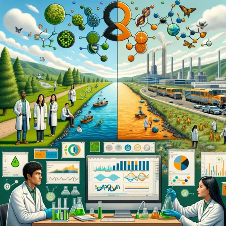圖 1. 在環(huán)境健康的創(chuàng)新與警惕之間架起橋梁。該圖說明了處理新興污染物和傳統(tǒng)污染物之間的平衡。它展示了綠色化學(xué)、機(jī)器學(xué)習(xí)、同一健康、暴露組和組學(xué)在環(huán)境科學(xué)與技術(shù)中的融合。左側(cè)描繪了自然環(huán)境中的生態(tài)友好型實踐,而右側(cè)則突出了對人為污染物的研究,強(qiáng)調(diào)了一種全面而積極的方法。