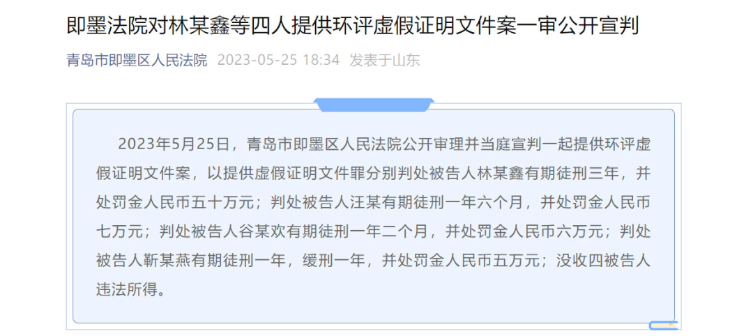 “十四五”以來(lái),生態(tài)環(huán)境部會(huì)同最高法、最高檢、公安部、市場(chǎng)監(jiān)管總局一起,連續(xù)四年針對(duì)第三方環(huán)保服務(wù)機(jī)構(gòu)造假的問(wèn)題開(kāi)展了專項(xiàng)整治。同時(shí),環(huán)境部還采用“四不兩直”檢查、監(jiān)督幫扶、大數(shù)據(jù)監(jiān)管,乃至中央生態(tài)環(huán)境保護(hù)督察等有效手段來(lái)打擊第三方環(huán)保服務(wù)機(jī)構(gòu)造假行為,取得了很好的效果。總體來(lái)看,打擊行動(dòng)取得了三方面效果:這三年,環(huán)境部查處了2260家有違法行為的第三方環(huán)保服務(wù)機(jī)構(gòu),向有關(guān)部門(mén)移送了193起案件進(jìn)行刑事立案,還公開(kāi)曝光了457個(gè)典型案例。另外,他們還查處了企業(yè)在環(huán)境自行監(jiān)測(cè)方面的造假案件4255件,向有關(guān)部門(mén)移送了930起涉嫌違法犯罪的案件。這些案件當(dāng)中,包括去年在社會(huì)上影響比較大的山東錦華公司的環(huán)評(píng)造假案、江西展航公司的環(huán)評(píng)造假案、廣東廣禾公司的機(jī)動(dòng)車(chē)檢測(cè)造假案等,這些案件都已經(jīng)宣判,并且產(chǎn)生了很好的社會(huì)效果,起到了震懾和警示作用。第二,推動(dòng)了行刑銜接,提升了監(jiān)管執(zhí)法效能。環(huán)境部和最高檢、公安部一起構(gòu)建了行刑銜接、一體化推進(jìn)的聯(lián)動(dòng)執(zhí)法機(jī)制,形成了共同會(huì)商、共同掛牌督辦、共同公布典型案件以及共同部署相關(guān)工作的“組合拳”,有效地提升了我們的監(jiān)管執(zhí)法效能。以前面提到過(guò)的“山東錦華公司造假案”為例,環(huán)評(píng)公司利用掛靠、偽造他人簽名的方式充當(dāng)虛假環(huán)評(píng)文件的制造者,這些年偽造虛假的環(huán)境影響報(bào)告書(shū)48份、環(huán)境影響報(bào)告表879份,數(shù)目巨大、性質(zhì)惡劣。▼“山東錦華環(huán)評(píng)造假案”宣判。圖片來(lái)源:青島市即墨區(qū)人民法院