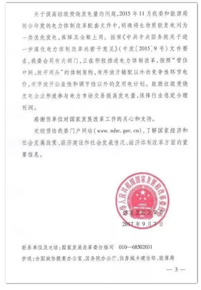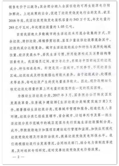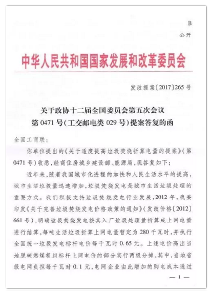 今年年初,環(huán)境商會以全國工商聯(lián)團體提案的形式向兩會遞交《關于適度提高垃圾焚燒折算電量的提案》,國家發(fā)改委于9月正式答復。