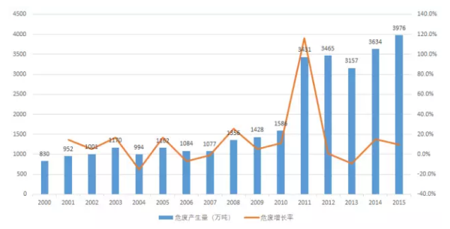 根據(jù)環(huán)保部公布的各年度環(huán)境統(tǒng)計年報,我國工業(yè)危險廢物年產(chǎn)生量處于上下小幅波動、整體逐步遞增的狀態(tài)。據(jù)統(tǒng)計,2015年我國危險廢物的產(chǎn)生量為3976.1萬噸。
