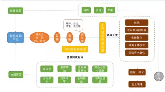 目前,我國對危險廢物的處理方式主要可分為有資源回收利用和終端處置,危險廢物處理全鏈條圖譜如下所示: