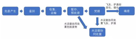 危險廢物終端處置方式主要為焚燒和安全填埋,同時水泥窯協(xié)同處置、等離子體技術(shù)等也逐漸發(fā)展應(yīng)用于實際。焚燒中產(chǎn)生的飛灰和爐渣會經(jīng)過固化、穩(wěn)化等技術(shù)處理后,進入填埋場。危險廢物焚燒和水泥窯協(xié)同處置本質(zhì)上都屬于高溫處理技術(shù),兩種處置方法全鏈條可簡化為下圖: