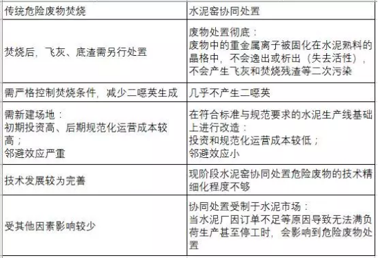 傳統(tǒng)的危險廢物焚燒技術(shù)與水泥窯協(xié)同處置危險廢物的兩者對比如下所示: