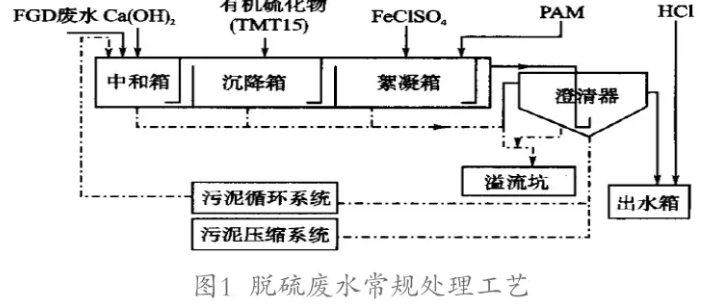 國內(nèi)脫硫廢水常規(guī)處理工藝如下:一般采用加石灰中和、絮凝、沉降處理后,經(jīng)澄清、PH調(diào)節(jié)達標后回用或排放。