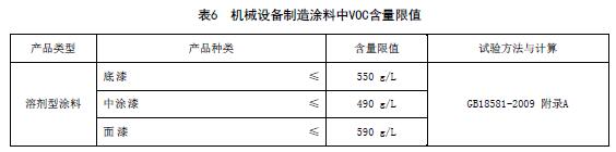 機(jī)械設(shè)備制造涂料中VOC含量限值應(yīng)符合表6的規(guī)定。