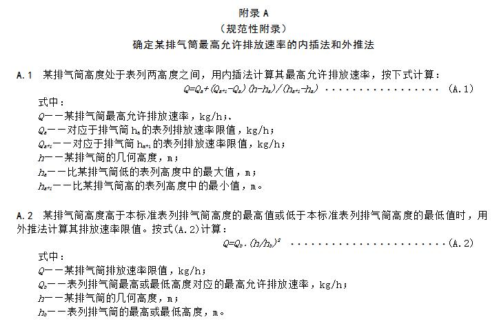 4.3.3.2若某排氣筒高度處于本標(biāo)準(zhǔn)列出的兩個(gè)值之間,其執(zhí)行最高允許排放速率以內(nèi)插法計(jì)算,內(nèi)插法的計(jì)算公式參見(jiàn)附錄A;當(dāng)某排氣筒的高度大于或小于本標(biāo)準(zhǔn)列出的排氣筒高度最大值或最小值時(shí),以外推法計(jì)算其最高允許排放速率,外推法計(jì)算公式參見(jiàn)附錄A。