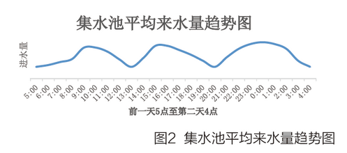 二十四小時平均進(jìn)水量趨勢圖如圖2所示,從圖可以看出,在早上7點(diǎn)左右進(jìn)水量逐漸增大,當(dāng)?shù)竭_(dá)十一點(diǎn)左右到達(dá)第一次峰值。這是由于人們早上用水量增大,通常情況下早上七點(diǎn)左右為用水高峰,而通過管網(wǎng)的延時,導(dǎo)致進(jìn)水量在十點(diǎn)左右到達(dá)高峰。同樣的十三點(diǎn)和第二天零點(diǎn)分別是兩次進(jìn)水高峰。第三次高峰段的延長是由于這段時間人們生活所致,例如晚飯時間用水及洗澡時間的用水等造成水量的持續(xù)高峰。