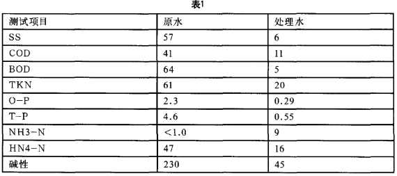 在采用生物法進(jìn)行脫磷時(shí),如果將規(guī)模比較小的脫氮槽放在脫磷槽前面,可以實(shí)現(xiàn)同時(shí)脫磷脫氮的目的。當(dāng)曝氣時(shí)間維持了7.2個(gè)小時(shí),脫磷槽和脫氮槽分別滯留時(shí)間為8.8個(gè)小時(shí)、5.8個(gè)小時(shí),BOD容積負(fù)荷為0.21 kg/m3?d,在MLSS為2630 mg/L等等運(yùn)行條件下,可以得到以下處理效果圖表。(見(jiàn)表1)