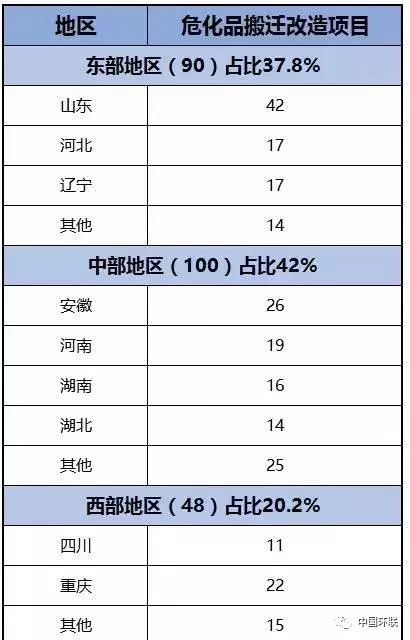 據(jù)了解,2015年,天津8·12爆炸事故發(fā)生后,工信部、國家發(fā)改委等遴選出238個?;钒徇w改造項目。按區(qū)域劃分,東部地區(qū)有90個,占項目總數(shù)的37.8%,中部地區(qū)有100個,占項目總數(shù)的42%;西部地區(qū)有48個,占項目總數(shù)的20.2%。