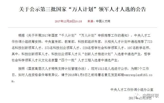 “萬人計劃”又名“國家高層次人才特殊支持計劃”,是一項面向國內(nèi)高層次人才的支持計劃。2012年國家“萬人計劃”啟動,目標是用10年時間,遴選1萬名左右自然科學、工程技術和哲學社會科學領域的杰出人才、領軍人才和青年拔尖人才,給予特殊支持。其中,“萬人計劃”領軍人才計劃支持8000名國家科技發(fā)展和產(chǎn)業(yè)發(fā)展急需緊缺的創(chuàng)新創(chuàng)業(yè)人才,包括科技創(chuàng)新領軍人才、科技創(chuàng)業(yè)領軍人才、哲學社會科學領軍人才、教學名師和百千萬工程領軍人才等類別。第三批“萬人計劃”領軍人才共有1513名各領域專家入選,其中723名科技創(chuàng)新領軍人才、373名科技創(chuàng)業(yè)領軍人才、220名哲學社會科學領軍人才、197名教學名師人選。