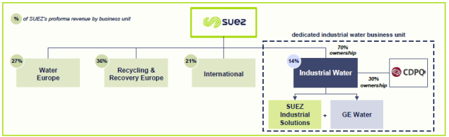 看重了GE水處理在工業(yè)水領(lǐng)域的優(yōu)勢,蘇伊士環(huán)境聯(lián)合加拿大基金公司Caisse de dép?t et placement du Québec (CDPQ)以32億歐元收購了GE的全部股權(quán),兩家將組成合資公司,其中蘇伊士環(huán)境持股70%。Jean-Louis Chaussade先生透露,GE水處理的出售競標(biāo)已經(jīng)進行好幾輪了,在第三輪也是最后一輪的對手就剩下了剛剛在去年年底收購了法國家具零售巨頭BUT的美國私募基金 Clayton, Dubilier&Rice。蘇伊士環(huán)境的財務(wù)主管Christophe Cross則表示收購一旦正式完成后蘇伊士將對其增資7.5億歐元。