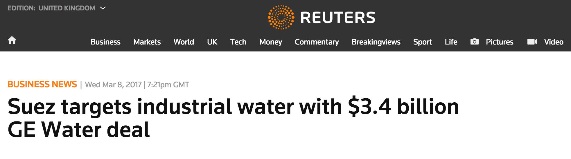 水行業(yè)巨頭法國蘇伊士環(huán)境聯(lián)合加拿大第二大養(yǎng)老金投資管理機構(gòu)—魁北克儲蓄投資集團(Caisse de dép?t et placement du Québec )正式確認收購GE水處理。GE水處理是在2016年10月宣布出售的,之后曾出現(xiàn)過諸如威立雅、全球最大儀器公司丹納赫集團(Danaher Corporation)、著名的私人股權(quán)投資和投資管理公司黑石集團(Blackstone Group)等潛在買家的傳聞。 在上個月底,蘇伊士環(huán)境的新聞發(fā)言人也對外宣布正在考慮收購GE工業(yè)水處理業(yè)務(wù)的可能性。是什么讓蘇伊士在官宣之后的半個月內(nèi)就完成這宗收購呢?今天我們將帶大家看看全球各大媒體對這次收購的解讀。