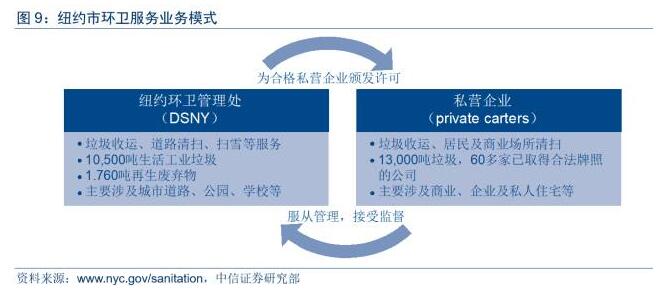 以紐約市為例,其環(huán)衛(wèi)服務(wù)業(yè)由政府環(huán)衛(wèi)管理處與私營(yíng)垃圾運(yùn)輸公司共同運(yùn)營(yíng),但私營(yíng)公司受到環(huán)衛(wèi)管理處監(jiān)管,并要遵守相關(guān)地方規(guī)范。紐約市環(huán)衛(wèi)管理處(DSNY)主要職責(zé)是垃圾收運(yùn)、道路清潔和清雪,它是世界上最大的環(huán)衛(wèi)管理處,負(fù)責(zé)每天收運(yùn)紐約市的10,500噸生活垃圾和工業(yè)垃圾以及1,760噸再生廢棄物。紐約市另外13,000噸垃圾由私營(yíng)垃圾運(yùn)輸公司(PrivateCartingCompanies)進(jìn)行收運(yùn),環(huán)衛(wèi)管理處對(duì)這些私人運(yùn)營(yíng)負(fù)責(zé)行使監(jiān)督管理職責(zé),并發(fā)布其需要遵守的法律法規(guī)。