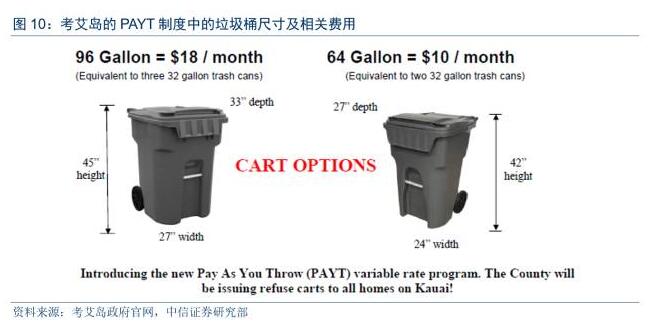 PAYT制度通常下的定價(jià)模式有全單位定價(jià)模式、部分單位定價(jià)及浮動(dòng)定價(jià)等三種模式。以全單位定價(jià)的PAYT模式為例,居民首先需要購(gòu)買由當(dāng)?shù)卣y(tǒng)一印刷的標(biāo)牌,并將標(biāo)牌粘貼到一定容量的垃圾袋上;或者根據(jù)自己產(chǎn)生垃圾量大小向政府申請(qǐng)垃圾桶,政府根據(jù)垃圾桶大小而收費(fèi)。以夏威夷州的考艾島為例,該地區(qū)在2015年7月開始實(shí)行PAYT制度,居民可以選擇兩種尺寸的垃圾桶,一種是96加侖的垃圾桶,每月需付費(fèi)18美元,一種是64加侖的垃圾桶,每月需付費(fèi)10美元,一個(gè)64加侖的車,每月10美元。