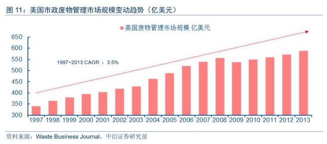 根據(jù)WasteBusinessJournal統(tǒng)計(jì),美國(guó)市政廢物管理市場(chǎng)規(guī)模自1997年的341億美元持續(xù)攀升至2013年的589億美元,期間復(fù)合增速為3.5%,高于同期人口增速和廢物產(chǎn)生量增速。受金融危機(jī)影響,市場(chǎng)規(guī)模自2008年的55.7億元略微下滑至2009年的53.7億元,但在2011年即恢復(fù)至金融危機(jī)前的水平。