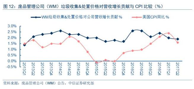 以廢品管理公司(WM)為例,2013年迄今,其廢物收集&處置季度均價(jià)均維持上漲態(tài)勢(shì),價(jià)格同比漲幅維持在1.4%~2.6%的區(qū)間之內(nèi)(季度均值為2.1%);此外,除2017Q1外,廢品管理公司(WM)季度均價(jià)漲幅均超過同期CPI漲幅。由此可見,在和上游工商業(yè)客戶及地方政府的博弈中,美國(guó)市政廢物管理公司確實(shí)擁較強(qiáng)的定價(jià)能力,能夠維持長(zhǎng)期可持續(xù)的溫和價(jià)格上漲。而行業(yè)內(nèi)企業(yè)擁有較強(qiáng)定價(jià)能力,是維持行業(yè)健康繁榮、企業(yè)盈利能力持續(xù)攀升的重要一環(huán)。