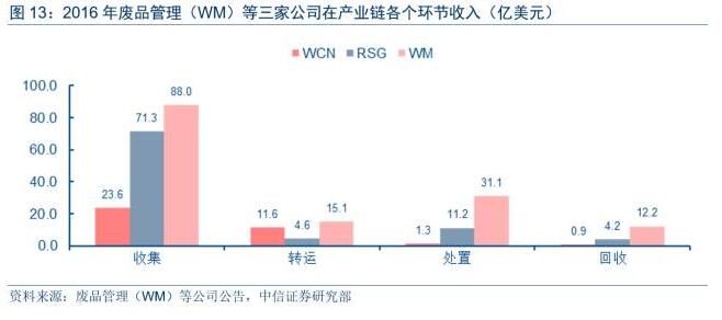 美國(guó)環(huán)衛(wèi)市場(chǎng)為典型的一體化模式,相關(guān)企業(yè)在大力參與前端收集&轉(zhuǎn)運(yùn)業(yè)務(wù)同時(shí),后端處置及資源回收領(lǐng)域也積極布局和參與,以充分發(fā)揮協(xié)同和提升公司競(jìng)爭(zhēng)優(yōu)勢(shì)。從廢品管理(WM)等三家全國(guó)性市政廢物管理公司的2016年收入構(gòu)成看,收集&轉(zhuǎn)運(yùn)業(yè)務(wù)收入分別占到三家公司2016年內(nèi)部抵消前總營(yíng)業(yè)收入的63%、75%和94%,后端處置分別站到合并抵消前營(yíng)業(yè)收入的19%、19%和4%。