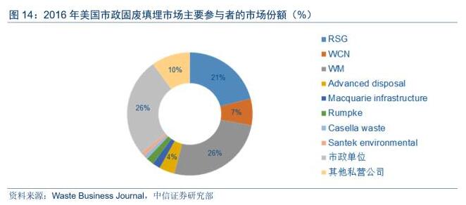廢品管理(WM)等美國(guó)三大環(huán)衛(wèi)龍頭公司除在前端收集及轉(zhuǎn)運(yùn)已經(jīng)牢牢樹立壟斷地位外,多年來通過在后端處置環(huán)節(jié)的持續(xù)大力參與,目前在填埋環(huán)節(jié)的領(lǐng)先優(yōu)勢(shì)也異常明顯。2016年,三大環(huán)衛(wèi)公司在填埋市場(chǎng)份額占比合計(jì)高達(dá)54%,WM、RSG及WCN在市政廢物總填埋量中占比分別為26%、21%、7%,填埋市場(chǎng)的寡頭壟斷特征突出。