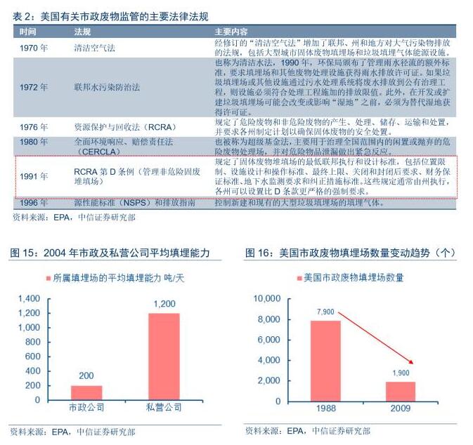 上世紀(jì)90年代,美國(guó)市政廢物填埋場(chǎng)曾經(jīng)爆發(fā)大氣、土壤、水源污染一系列環(huán)境污染問題,導(dǎo)致居民對(duì)于社區(qū)周邊建設(shè)和運(yùn)營(yíng)垃圾填埋場(chǎng)的反對(duì)聲音日益高漲。針對(duì)上述環(huán)境問題,1991年,專門用于監(jiān)管非危廢填埋場(chǎng)的《資源保護(hù)與回収法》D條例頒布,大幅提升了市政廢物填埋場(chǎng)的設(shè)計(jì)、運(yùn)營(yíng)及環(huán)保等標(biāo)準(zhǔn)。受此影響,大量靠近社區(qū)或運(yùn)營(yíng)不達(dá)標(biāo)的填埋場(chǎng)在上世紀(jì)90年代被迫關(guān)停,且填埋場(chǎng)的建設(shè)和運(yùn)營(yíng)成本上升明顯。根據(jù)EPA的統(tǒng)計(jì),美國(guó)市政廢物填埋市場(chǎng)數(shù)量自1988年的7,900座下滑約75%至2009年的1,900座,填埋場(chǎng)數(shù)量降幅明顯。