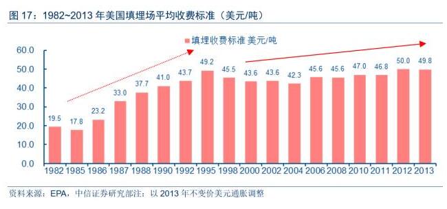 美國(guó)市政廢物的填埋平均價(jià)格自1985年的17.8美元/噸上升至1995年的49.2美元/噸,10年間價(jià)格漲幅接近3倍,收費(fèi)上漲的主要原因是監(jiān)管加嚴(yán)和標(biāo)準(zhǔn)提升帶動(dòng)填埋場(chǎng)的建造和運(yùn)營(yíng)成本上升明顯,此階段是典型的成本拉動(dòng)型價(jià)格上漲。在2000年之后,廢物填埋收費(fèi)呈現(xiàn)溫和且持續(xù)的上漲,自2000年的43.6美元/噸溫和上漲至2013年39.8美元/噸,2000~2013年價(jià)格復(fù)合增速為1.1%,通脹及寡頭壟斷的市場(chǎng)結(jié)構(gòu)是該階段價(jià)格上漲的重要推動(dòng)力。