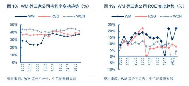 美國(guó)環(huán)衛(wèi)龍頭公司的毛利率及凈資產(chǎn)收益率(ROE)等財(cái)務(wù)指標(biāo)持續(xù)表現(xiàn)突出。在2007~2016年的過去10年中,廢品管理(WM)、共和服務(wù)(RSG)、廢物聯(lián)合公司(WCN)的毛利率全部維持在35%之上,其中廢物聯(lián)合公司(WCN)長(zhǎng)期維持在40%之上。從凈資產(chǎn)收益率看,上述三家公司的凈資產(chǎn)收益率過去10年的均值分別為15%、8%和8%,其中廢品管理公司的凈資產(chǎn)收益率顯著超出其他兩家公司,主要是因?yàn)橄啾葍蓚€(gè)競(jìng)爭(zhēng)對(duì)手,公司擁有更高的資產(chǎn)周轉(zhuǎn)率和財(cái)務(wù)杠桿。