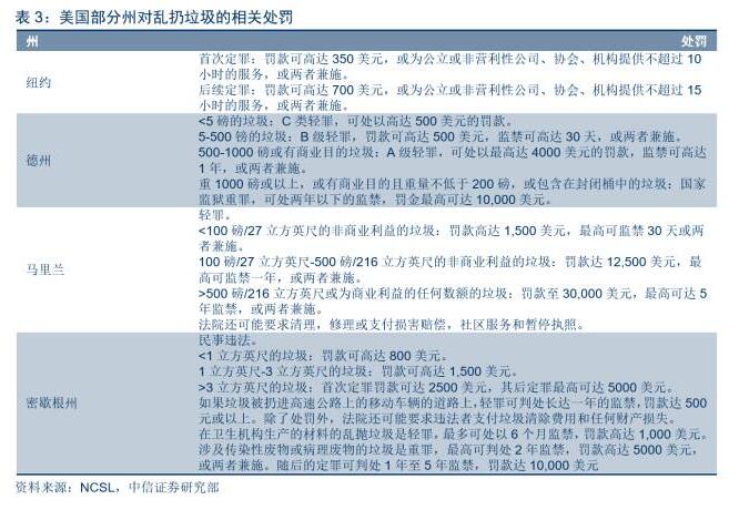 目前在美國(guó),道路清掃業(yè)務(wù)市場(chǎng)規(guī)模相比清運(yùn)和清理而言幾乎可以忽略不計(jì),主要原因是美國(guó)道路清掃需求較低,這和國(guó)內(nèi)環(huán)衛(wèi)市場(chǎng)以清掃為主的現(xiàn)狀存在顯著差異。美國(guó)亂扔垃圾是一種犯罪行為,50個(gè)州均制定禁止亂扔垃圾的法律,罰款范圍從科羅拉多州的20美元到馬里蘭州的30,000美元,且在更嚴(yán)重情況下會(huì)處以監(jiān)禁,比如說在愛達(dá)荷州的刑期為10天,在田納西州高達(dá)6年。對(duì)亂扔垃圾嚴(yán)格立法導(dǎo)致美國(guó)道路較為整潔,大多數(shù)城市的道路清掃頻率為每周一次,部分城市甚至每個(gè)月做一次道路清掃,道路清掃的需求非常低,相應(yīng)導(dǎo)致清掃業(yè)務(wù)市場(chǎng)規(guī)模比較小。
