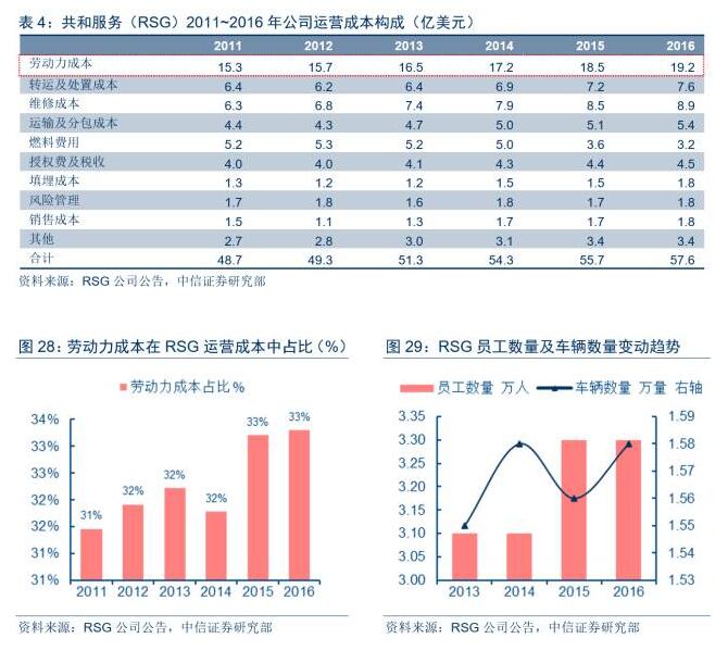 美國(guó)生活垃圾的清掃與收集基本實(shí)現(xiàn)完全機(jī)械化,由居民先行實(shí)施垃圾分類處理,環(huán)衛(wèi)工人直接通過駕駛特制裝載車收集社區(qū)住戶附近垃圾桶內(nèi)的廢棄物,然后將市政廢物運(yùn)往垃圾轉(zhuǎn)運(yùn)中心或者最終處理設(shè)施。以共和服務(wù)(RSG)為例,從員工數(shù)量和公司機(jī)械設(shè)備數(shù)量看,RSG的員工數(shù)量和車輛數(shù)量大體維持在2:1的水平;在2011~2016年公司運(yùn)營(yíng)成本構(gòu)成中,勞動(dòng)力成本在公司運(yùn)營(yíng)成本占比穩(wěn)定維持在31%~33%的區(qū)間內(nèi),顯著低于國(guó)內(nèi)環(huán)衛(wèi)市場(chǎng)中的勞動(dòng)力成本占比。由此可見,通過持續(xù)不斷的機(jī)械化替代,廢物管理市場(chǎng)各參與方的勞動(dòng)力成本規(guī)模和占比確實(shí)可以實(shí)現(xiàn)有效控制。