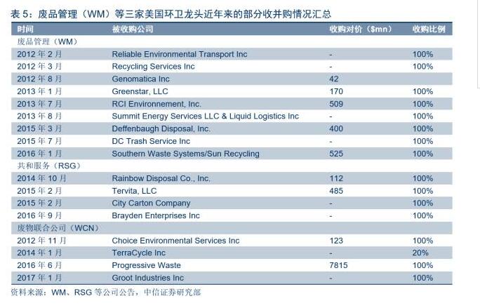 在市政廢物管理市場(chǎng)目前面臨廢物產(chǎn)生量增長(zhǎng)緩慢和資源循環(huán)利用的不利因素下,通過外延并購(gòu)也是企業(yè)提升收入和加速成長(zhǎng)的重要手段。廢品管理(WM)等三家龍頭公司在過去幾年中持續(xù)實(shí)施外延并購(gòu),以提升市場(chǎng)占有率和企業(yè)定價(jià)能力。從并購(gòu)對(duì)象標(biāo)的類型看,大型及小型公司、前端收集及后端處置公司等均有涉及。