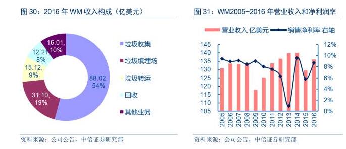廢品管理(WM)是北美規(guī)模最大固廢處理公司,目前共擁有2.2萬(wàn)輛垃圾收集車輛,4.12萬(wàn)名員工,262個(gè)填埋場(chǎng),310個(gè)固廢中轉(zhuǎn)站,120家資源回收中心和17家垃圾焚燒發(fā)電廠,服務(wù)美國(guó)、加拿大和波多黎各等2,700萬(wàn)戶工商業(yè)和居民客戶。2016年,公司營(yíng)收規(guī)模為136.09億美元,凈利潤(rùn)為11.82億美元,目前市值約330億美元,是標(biāo)普500指數(shù)成分股。