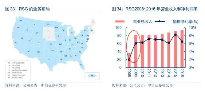 1981年,公司前身RepublicIndustry作為垃圾處理公司成立;1998年,RepublicIndustry將共和國(guó)服務(wù)公司(RSG)分拆上市;2008年6月,RSG以61億美元的股票收購(gòu)其較大的競(jìng)爭(zhēng)對(duì)手AlliedWasteIndustries,一舉成為美國(guó)第二大廢物管理公司。大體量并購(gòu)?fù)苿?dòng)公司營(yíng)業(yè)收入從2008年的36.85億美元上升到2009年的81.99億美元,同比上升122.49%;凈利潤(rùn)從2008年的0.74億美元上升到2009年的4.95億美元,同比上升570.73%。