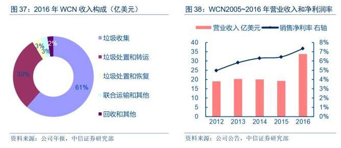從收入規(guī)???,廢物聯(lián)合公司(WCN)是北美第三大固體廢物服務(wù)公司,也是北美領(lǐng)先的油田廢物處理公司,在美國(guó)和加拿大提供垃圾收集、轉(zhuǎn)運(yùn)、處置和回收服務(wù)。截至2016年末,公司經(jīng)營(yíng)261個(gè)固體廢物收集操作網(wǎng)絡(luò),135個(gè)轉(zhuǎn)運(yùn)站,7個(gè)聯(lián)運(yùn)設(shè)施,71個(gè)回收中心,93個(gè)垃圾填埋場(chǎng),22個(gè)E&P液體廢物注入井和17個(gè)E&P廢物處理和采油設(shè)施??蛻艉w美國(guó)40個(gè)州和加拿大5個(gè)省份的住宅、商業(yè)、工業(yè)和E&P客戶。2016年公司實(shí)現(xiàn)營(yíng)業(yè)收入33.76億美元,凈利潤(rùn)2.47億美元。