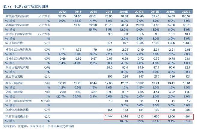 在當(dāng)前階段,國(guó)內(nèi)環(huán)衛(wèi)服務(wù)市場(chǎng)主要分為道路清掃保潔、垃圾清運(yùn)和公廁維護(hù)保潔三部分。根據(jù)測(cè)算,我們預(yù)計(jì)2017年我國(guó)環(huán)衛(wèi)市場(chǎng)規(guī)模為1,513億元,其中清掃、清運(yùn)及公廁維護(hù)的市場(chǎng)規(guī)模分別為1,085、247、181億元;且我們預(yù)計(jì)環(huán)衛(wèi)市場(chǎng)規(guī)模在2020年將進(jìn)一步增加至1,964億元,2017~2019市場(chǎng)復(fù)合增速為9.1%。我們測(cè)算的基本假設(shè)如下: