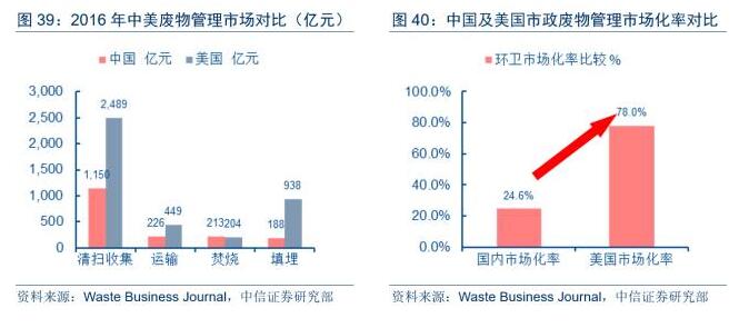 從市場(chǎng)規(guī)模和市場(chǎng)化程度的國(guó)際比較看,國(guó)內(nèi)環(huán)衛(wèi)市場(chǎng)擴(kuò)容潛力充分,2016年的美國(guó)市政廢物管理市場(chǎng)規(guī)模高達(dá)4,080億元(600億美元),是同期國(guó)內(nèi)市場(chǎng)規(guī)模的近3倍。對(duì)于從事環(huán)衛(wèi)業(yè)務(wù)的公司而言,除享受行業(yè)整體高單位數(shù)增長(zhǎng)的成長(zhǎng)擴(kuò)容潛力外,更大的成長(zhǎng)紅利在于市場(chǎng)化加速推進(jìn)帶來的訂單轉(zhuǎn)移。從市場(chǎng)化程度看,目前美國(guó)市政廢物管理市場(chǎng)的市場(chǎng)化率為78.0%,私營(yíng)企業(yè)在市場(chǎng)影響力和占有率等方面中擁有支配地位;而根據(jù)我們的測(cè)算,目前我國(guó)市政廢物管理市場(chǎng)(環(huán)衛(wèi)+最終處置)的市場(chǎng)化率僅為24.6%,其中我們估計(jì)環(huán)衛(wèi)的市場(chǎng)化率約為20%,和美國(guó)市場(chǎng)差距甚遠(yuǎn)?;诖?,市場(chǎng)化率差異蘊(yùn)含龐大的市場(chǎng)化加速推進(jìn)帶來的訂單轉(zhuǎn)移釋放機(jī)遇。